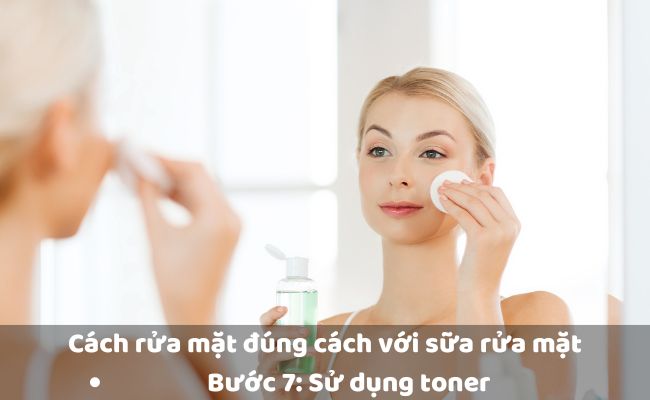 Sử dụng toner là bước cuối cùng trong 7 bước rửa mặt, có tác dụng cân bằng độ pH là lấy lại độ ẩm tự nhiên cho da. Bạn có thể tìm kiếm những loại toner chứa thành phần như nước hoa hồng, hoa cúc để làm dịu da hoặc axit salicylic để kiểm soát mụn. Khi sử dụng, chỉ cần lấy một lượng nhỏ toner thoa đều lên da, tập trung vào vùng da chữ T.