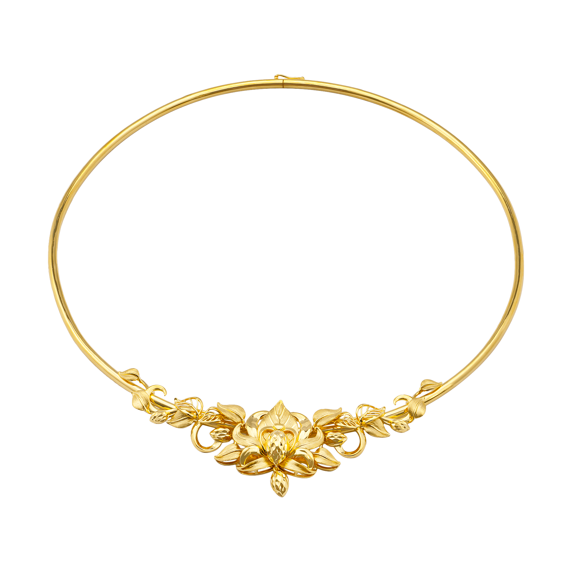 Ưu tiên hàng đầu cho các nàng dâu mới, mang đến kiềng cưới trong BST Trầu Cau sở hữu thiết kế dựa trên lá trầu quả cau. Chế tác từ vàng 18K trên thiết kế độc đáo, chiếc kiềng cưới mang vẻ đẹp vừa truyền thống lại vừa hiện đại.